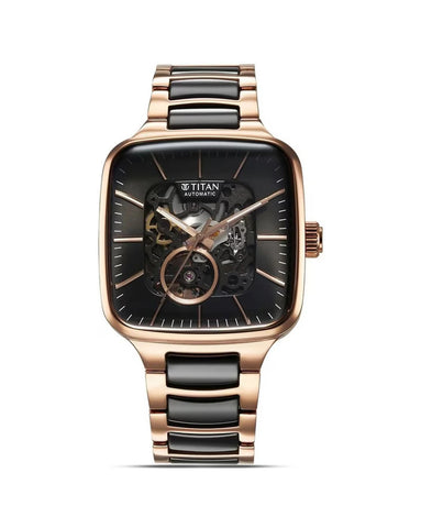 The Titan Ceramic Fusion Skeleton watch blends cutting-edge design with sophisticated craftsmanship. Featuring a striking rich black dial and a transparent skeleton layout, this timepiece showcases its intricate automatic movement. The combination of a steel and ceramic strap adds both durability and elegance. Ideal for those who appreciate a bold, modern look with high-tech precision.