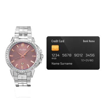 The ALBA Foxy Brown Dial Ladies Watch (Model AH7CX5X1) is a striking blend of elegance and contemporary style. Featuring a rich brown dial that radiates warmth, this timepiece is enhanced with sparkling crystals around the bezel, adding a touch of glamour to its sophisticated design. The sleek stainless steel case and bracelet offer durability and a polished finish, making it the perfect accessory for both day-to-day wear and special occasions. With its refined look and precise movement, the ALBA Foxy watch is a timeless piece that elevates any outfit with a dash of luxury.