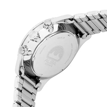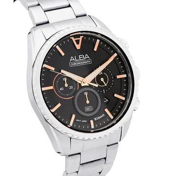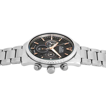 The ALBA Jet Black Dial Chronograph Men's Watch (AT3H81X1) combines bold style with precision. Featuring a striking black dial, silver-tone markers, and a durable stainless steel case, it offers a sleek design with multifunctional chronograph features. The black leather strap ensures comfort, while the reliable quartz movement and water resistance make it a practical yet stylish choice for any occasion.