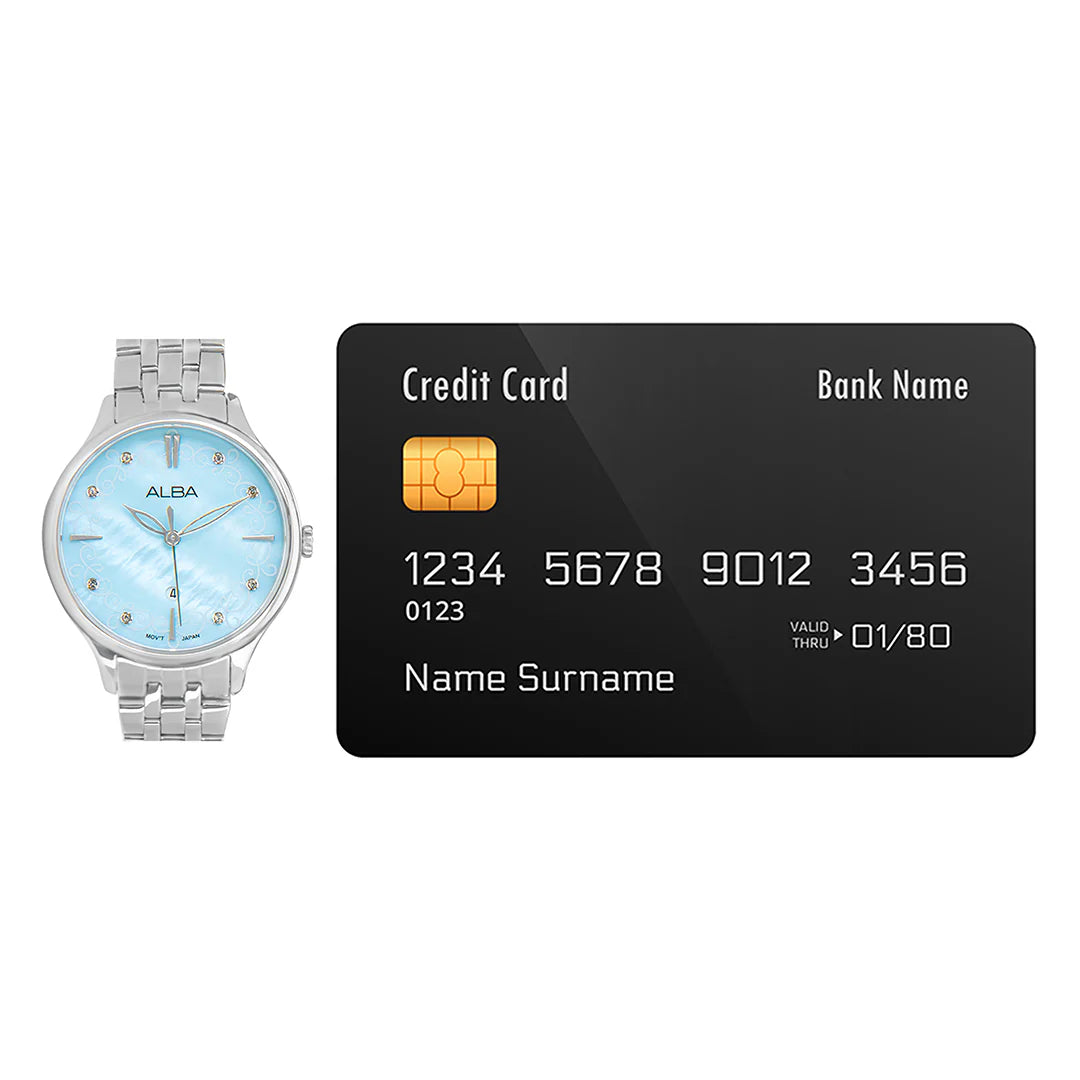 The ALBA Light Blue MOP Patterned Dial Ladies Watch AH7CR9X1 is a beautifully crafted timepiece that combines elegance with a touch of artistry. Featuring a light blue mother-of-pearl (MOP) patterned dial, the watch reflects a soft, iridescent sheen, creating a serene and sophisticated look. The delicate pattern adds a unique texture, enhancing the watch's refined aesthetic. Set in a durable stainless steel case, with a comfortable matching band, this watch is perfect for elevating any outfit, from casual to formal. Its timeless design makes it a standout accessory for the modern woman who values both style and quality.