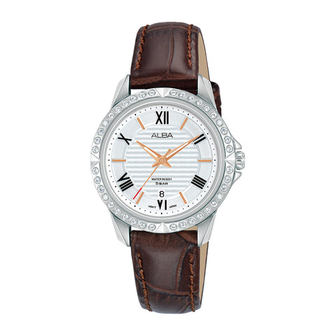 The ALBA Silver White Patterned Dial Ladies Watch AH7X03X1 offers a graceful and refined aesthetic, featuring a beautifully textured silver-white dial that catches the light with every movement. The watch is complemented by a rich brown leather strap, adding a touch of warmth and elegance. Perfect for those who appreciate timeless design, this watch effortlessly combines sophistication with everyday wearability.