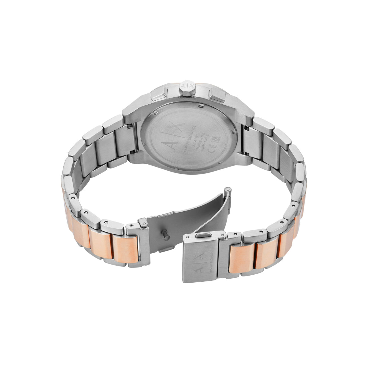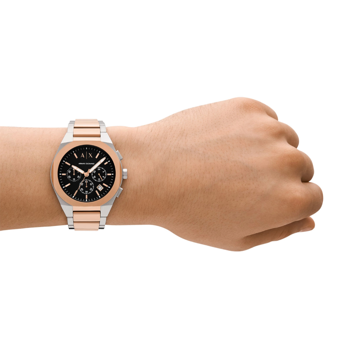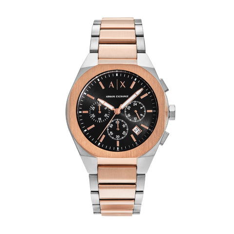 Refined with a bold edge, this 42mm Armani Exchange watch makes a confident statement. The black sunray dial is accented with sleek chronograph sub-dials, all housed within a durable stainless steel case. A striking two-tone bracelet—balancing polished silver and gold finishes—adds a modern touch of contrast. Protected by mineral glass and powered by a reliable quartz movement, this watch also features a functional crown for precise time adjustment. Designed for the man who values both precision and style, it's the perfect blend of performance and sophistication.