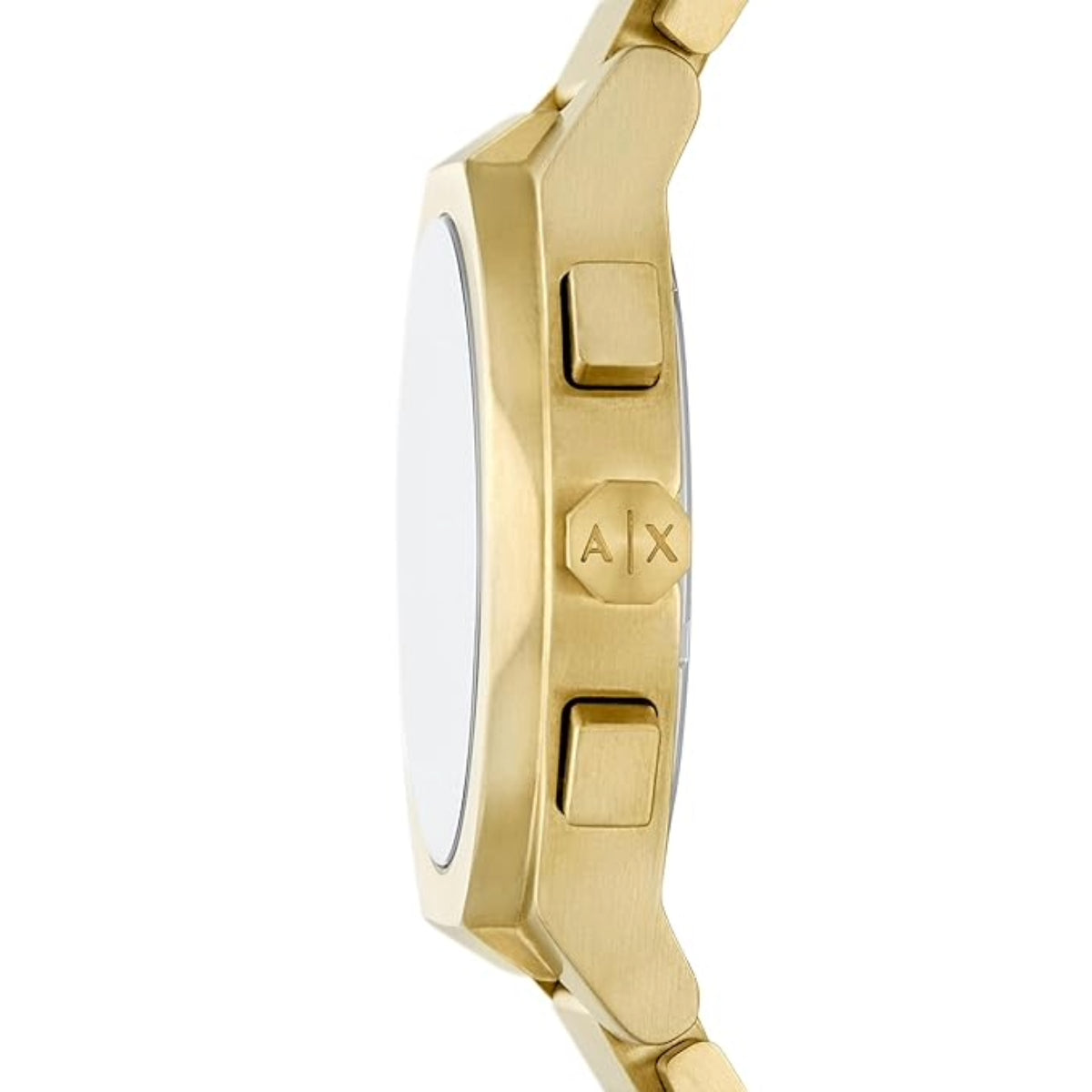 Elevate your style with this striking 42mm chronograph watch from Armani Exchange. Featuring a sleek black sunray dial set within a polished gold-tone stainless steel case and matching bracelet, this timepiece delivers bold sophistication with every glance. The chronograph functionality adds precision to your day, while the mineral glass ensures lasting clarity and protection. Complete with a convenient crown for easy time adjustment, this watch is the perfect blend of refined design and everyday performance — a true standout for the modern man.