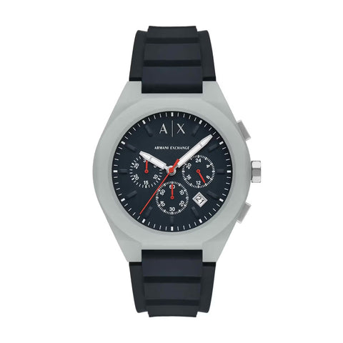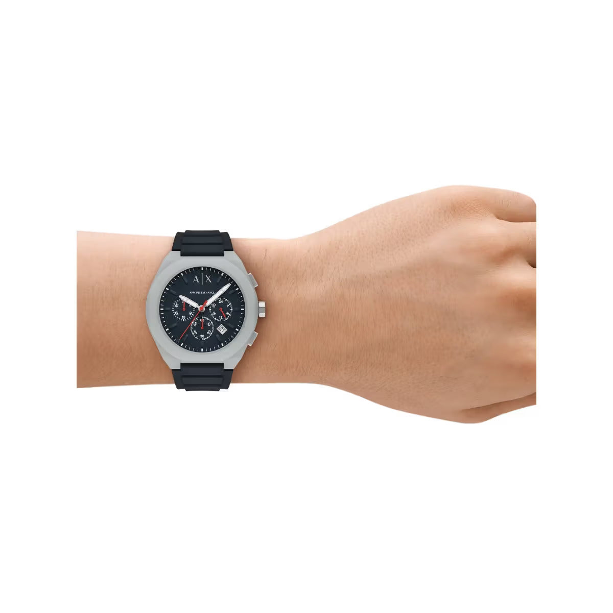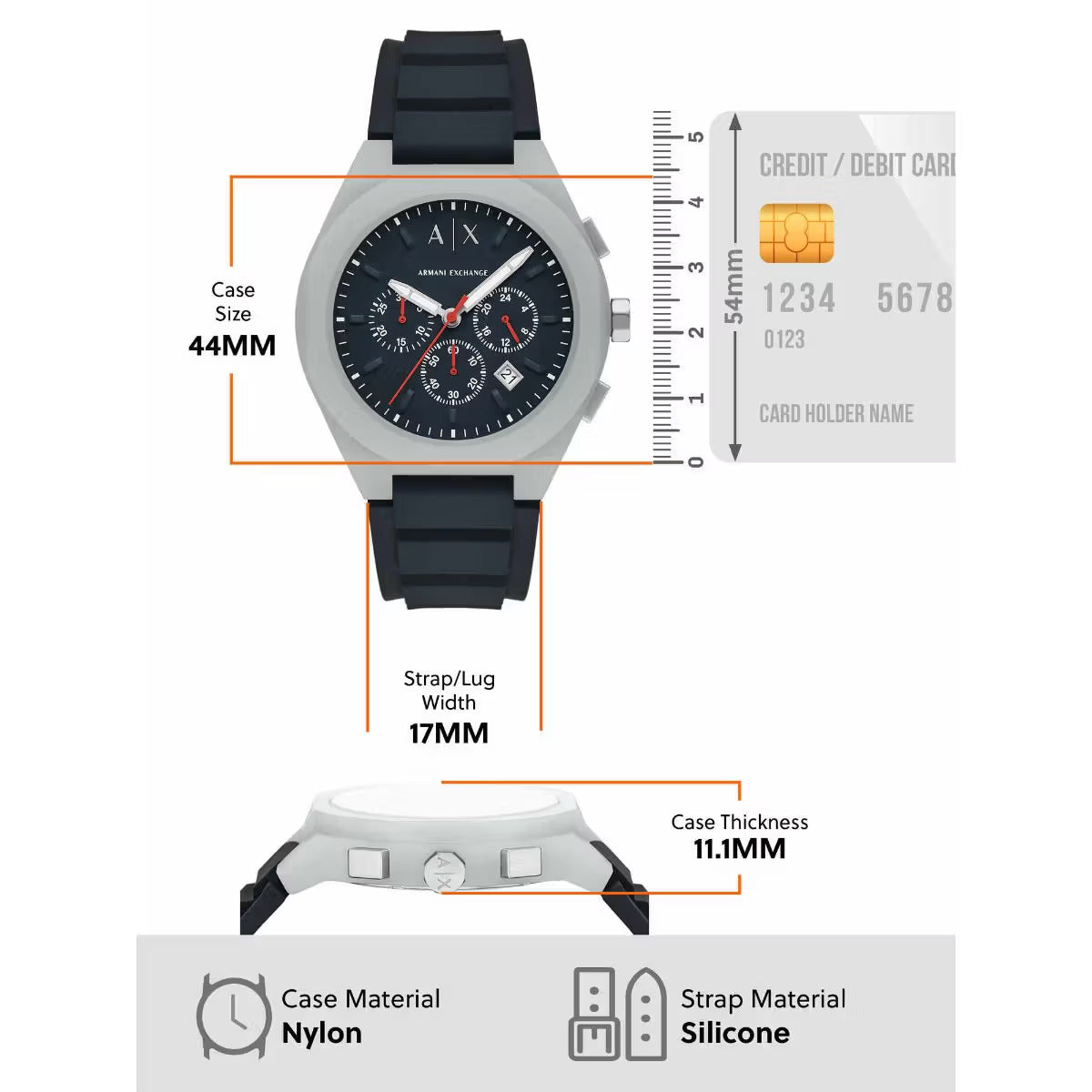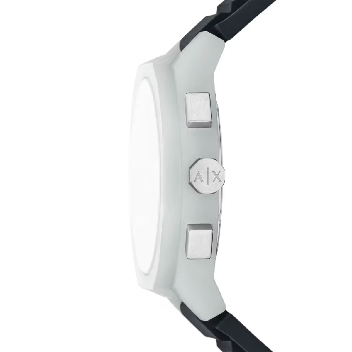 Embrace minimalist style with a bold attitude in the Armani Exchange Sync chronograph. This monochromatic gray timepiece blends streetwear influence with modern design, featuring a matte dial, tonal sub-dials, and sleek silicone strap for a seamless, streamlined look. The lightweight nylon case offers rugged durability with a contemporary edge, enhanced by an all-new glow-in-the-dark finish. Paired with luminescent hands for visibility in any light, this watch is a confident, understated statement piece—built to turn heads day or night.