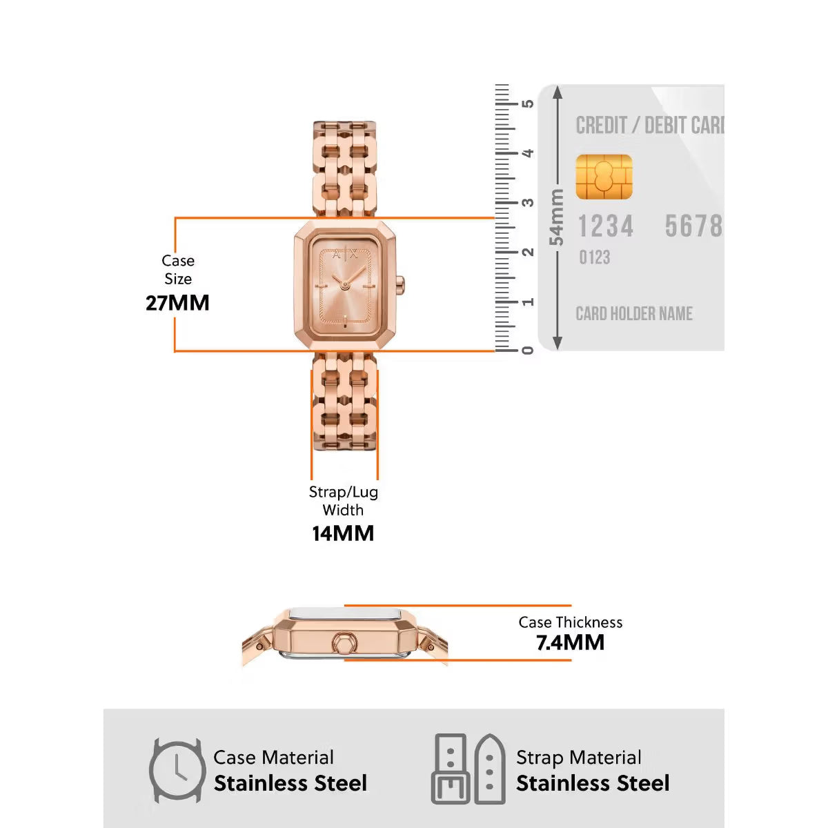 Elevate your style with this impeccably designed Armani Exchange timepiece, where modern elegance meets minimalist charm. Encased in a sleek rose gold-tone rectangular stainless steel frame, the watch features a sunray rose gold dial with a clean two-hand display — a celebration of simplicity and sophistication. The matching rose gold-tone bracelet seamlessly blends with the dial, offering a bold monochromatic look that's both refined and fashion-forward. With its sharp angles and crisp lines, this watch is a contemporary statement piece crafted for those who appreciate subtle luxury and modern design.