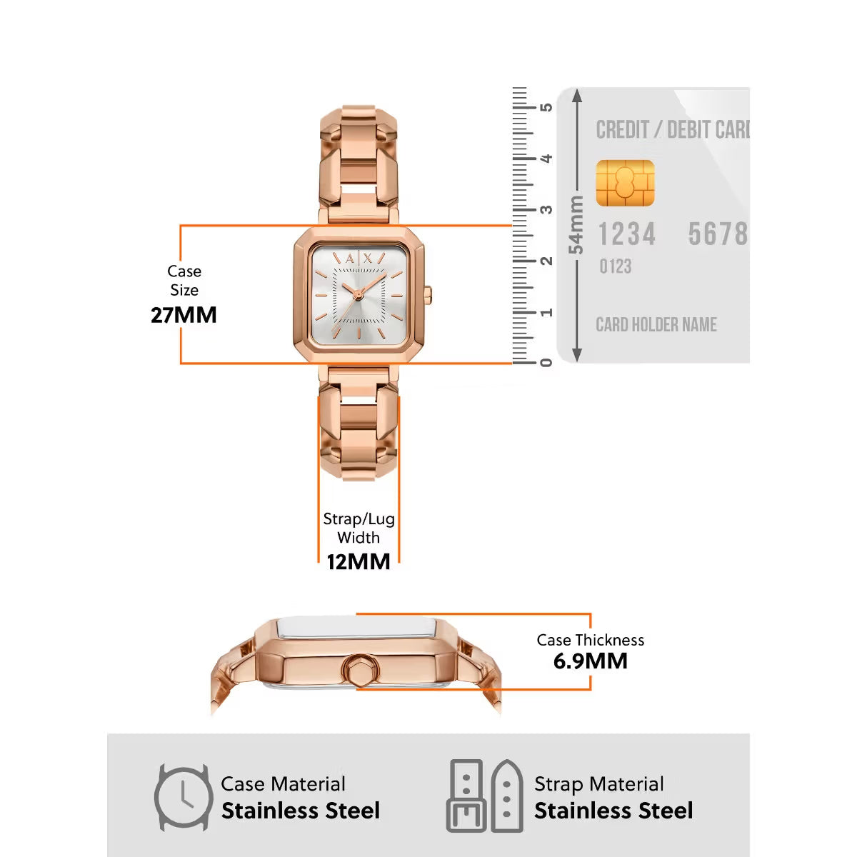 Blending timeless style with reliable performance, this women's analog watch from Armani Exchange is a refined accessory for any occasion. Powered by precise quartz movement and protected by durable mineral glass, the sleek silver square dial is set within a compact 27 mm case. The minimalist three-hand design exudes subtle sophistication, while the rose gold-toned stainless steel strap adds a warm, luxurious touch. Finished with a secure jewellery clasp, this watch offers both elegance and comfort for your wrist.