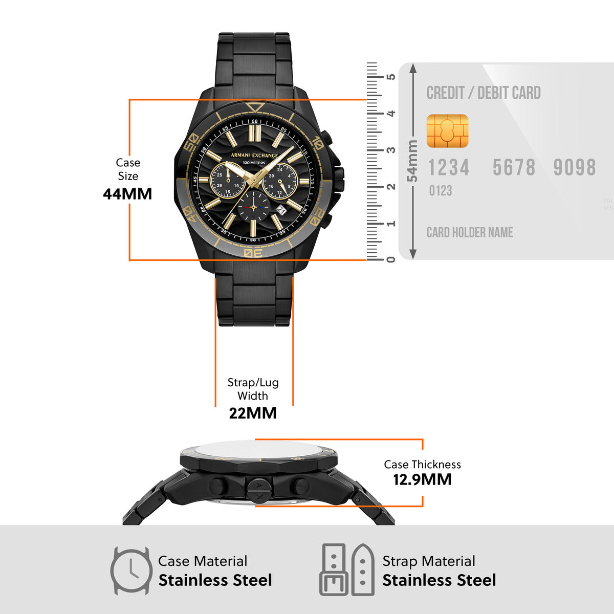 Make a powerful statement with this 44mm men’s watch from Armani Exchange. Crafted for the modern man, it features a striking black textured dial housed in a sleek black stainless steel case and bracelet. The chronograph movement offers both style and functionality, while the mineral glass provides reliable protection against everyday wear. Designed with a bold round face and equipped with a crown for easy time adjustment, this timepiece blends rugged appeal with refined detailing—perfect for those who appreciate both fashion and precision.