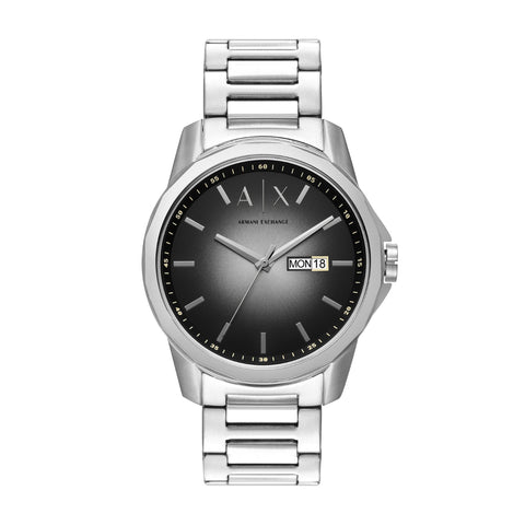 This 44mm Armani Exchange timepiece showcases a refined gray sunray dial paired with a precise three-hand day-date movement for everyday functionality. Finished with a classic stainless steel bracelet, it offers a sharp, modern look that's perfect for both business and casual wear. A bold expression of minimalism with a metropolitan edge.