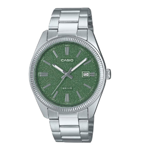Turn heads with the Casio Enticer MTP-1302DA-3AVDF — a sleek blend of bold aesthetics and reliable performance. Featuring a striking metallic green dial with a sunburst effect, this analog timepiece adds a modern edge to classic design. Crafted with a durable stainless-steel band and case, it offers everyday versatility with refined appeal. The minimal dial layout includes a clear date display at 3 o’clock, silver-tone hands, and bold hour markers for easy readability. With 50-meter water resistance, it’s built to keep up with both your workweek hustle and weekend adventures.