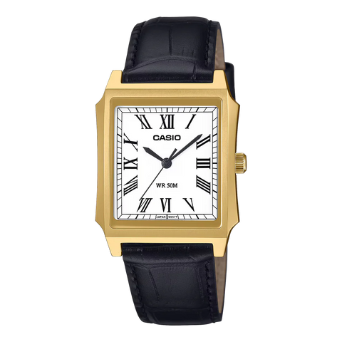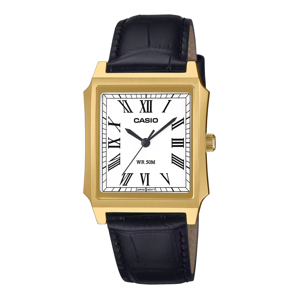 The Casio MTP-B190GL-7BVDF is a refined timepiece that seamlessly blends classic aesthetics with modern functionality. Designed for men who appreciate understated elegance, this watch features a rectangular gold-tone stainless steel case, a minimalist white dial with Roman numeral markers, and a genuine black leather strap. Whether you're attending a formal event or seeking an everyday accessory, this watch offers versatility and sophistication...