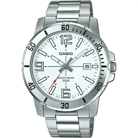 Sleek, durable, and effortlessly stylish, the Casio MTP-VD01D-7BVUDF from the Enticer Men collection is designed to complement any wardrobe. Featuring a crisp white dial set within a polished silver stainless steel case and matching bracelet, this analog watch strikes the perfect balance between minimalism and sophistication. Powered by reliable quartz movement and offering water resistance up to 50 meters, it's built for both daily wear and lasting performance—making it an ideal choice for men who value timeless design with dependable function.