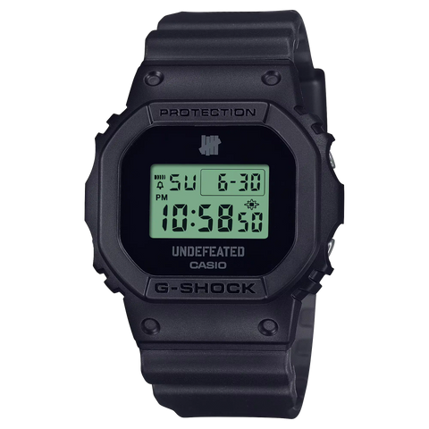 Straight from L.A.’s streetwear scene, G-SHOCK teams up with legendary sneaker boutique UNDEFEATED to drop a bold take on the DWE-5600. Featuring a green LCD, black case, and semi-transparent band, this watch flaunts UNDEFEATED’s five-strike logo on the back, strap, and glowing screen.
