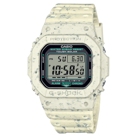 The G-5600BG-5 blends style with sustainability. Made using recycled resin scraps, its unique beige pattern features hints of white and olive from leftover materials. Powered by Tough Solar, it charges even under indoor light—perfect for eco-conscious wearers. Note: Color and pattern may vary slightly due to its recycled nature.