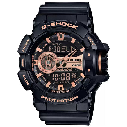Introducing the latest from the indomitable G-SHOCK line, the GA-400 collection takes toughness to a new level with its innovative large rotary switch for intuitive operation. Featuring the iconic G-SHOCK black with bold gold accents, this model embodies a style inspired by HIP-HOP and B-BOY fashion. The sleek black and gold color scheme is mirrored across the case, band, and face, creating a strikingly cool and bold design that stands out as a true fashion statement. Perfect for those who demand both style and durability, this watch is a must-have for anyone looking to make a statement with their timepiece.