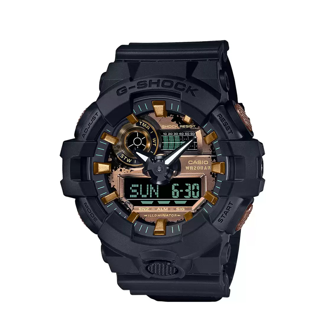 Make a bold statement with the G-SHOCK, designed to embody the raw power and resilience of rusted iron. This timepiece merges neoclassic black with sepia tones, mimicking the weathered texture of metal that stands the test of time. Accented with subtle light blue highlights, it brings a touch of modernity to the rustic, rugged aesthetic. A tribute to G-SHOCK's unwavering commitment to toughness, this watch blends timeless design with a distinctive, industrial flair.