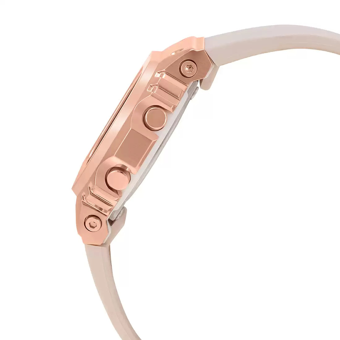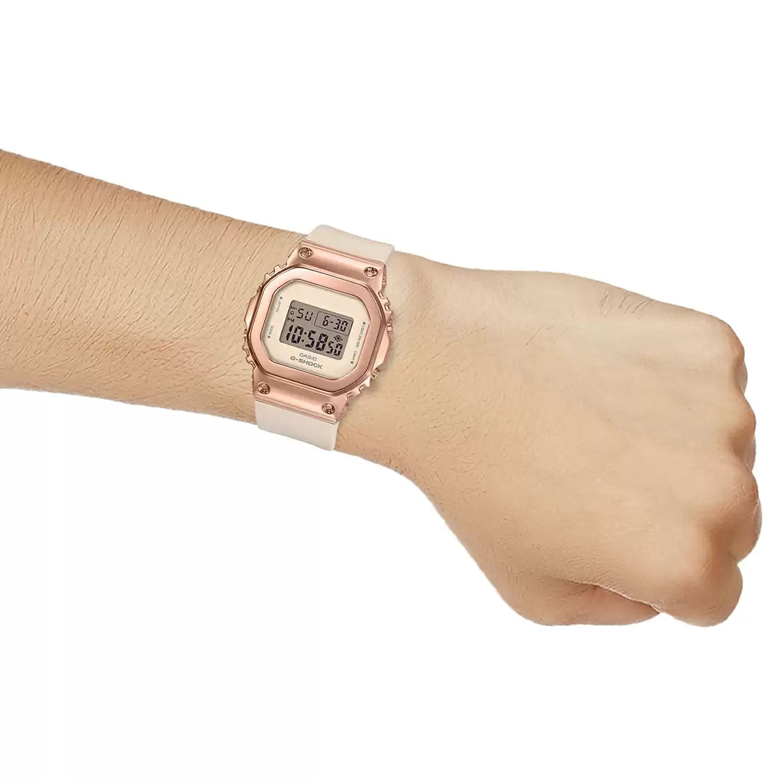 Introducing the compact G-SHOCK models, perfect for women who love a bold, mannish aesthetic. These watches feature the iconic square design of the 5600 Series, enhanced with a sleek, metal-covered bezel. Offering all the shock resistance of the GM-5600 in a more petite, lightweight form, they provide a comfortable and secure fit for any wrist. The mirror-finished case and bezel add a touch of elegance, while the stylish designs seamlessly blend casual cool with high-end appeal. Available in four stunning colors, including two pink gold options, a champagne gold, and a silver model, these timepieces elevate your streetwear style effortlessly.
