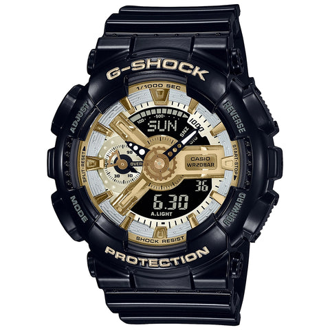 Experience the legendary oversized GA-110 in a more compact design, offering a watch face crafted for depth and intricate details. This timepiece combines a striking two-tone color scheme of gleaming gold and sleek silver accents against the classic black G-SHOCK body. With its smaller profile, it becomes the ideal casual fashion accessory, perfectly suited for younger G-SHOCK enthusiasts who want to make a bold yet refined statement.