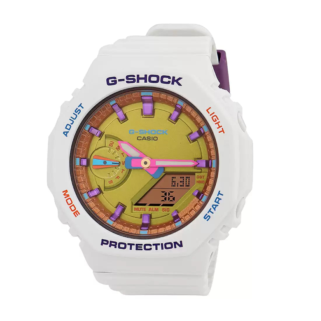 Add a pop of color to your summer style with the G-SHOCK GMA-S2100. Designed to capture the vibrant energy of the season, this watch features a flat dial with bold bar indexes, each adding a unique splash of color to reflect the carefree, sunny days ahead. Its modern and minimalist design is the perfect balance of fun and functionality, making it an ideal accessory for any summer adventure. Embrace the festive spirit with a timepiece that’s as bright and lively as your favorite summer moments.