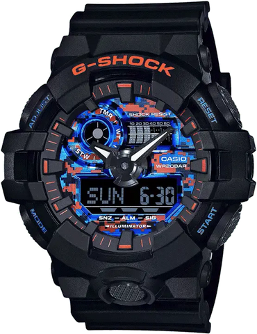 Stylish and rugged, the Casio G1098 GA-700CT-1ADR combines a black analog and digital display for men. Featuring a durable resin case, 200m water resistance, and a sleek, sporty design, it's perfect for both everyday wear and outdoor adventures