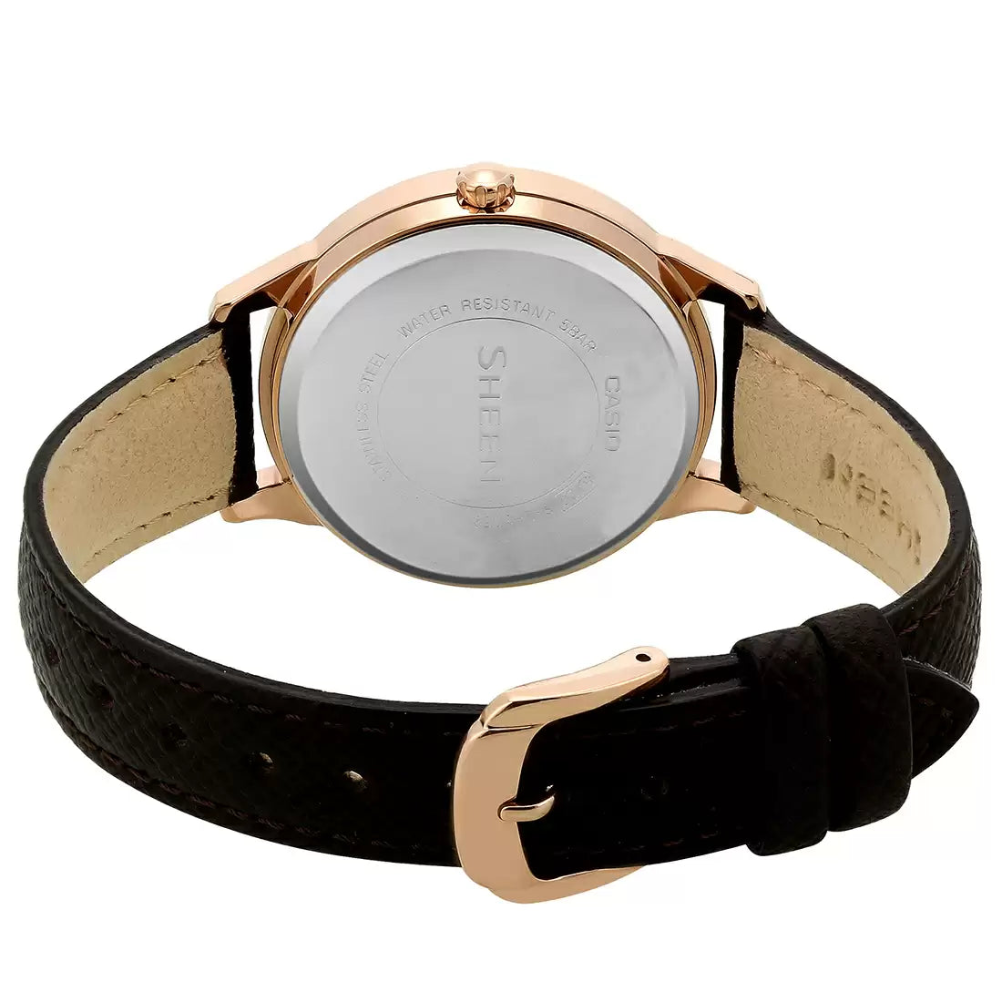 Elevate your style with the CASIO SHEEN SHE-3058PGL-5AUDR, a refined timepiece crafted for the contemporary woman who values elegance and precision. Featuring a radiant pink gold ion-plated stainless steel case paired with a rich brown leather strap, this watch blends classic charm with a fresh, modern edge. The sunray dial is adorned with delicately set Swarovski® crystals and subtle sub-dials, offering day, date, and 24-hour indicators — all encased in scratch-resistant mineral glass. Water-resistant and effortlessly chic, it’s the perfect companion for both everyday moments and special occasions.