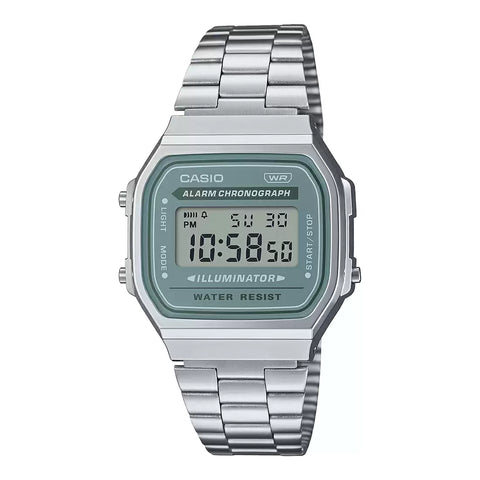 Step back in style with the Casio A168WA-3AYDF from the iconic Vintage Collection—a nostalgic nod to classic digital design with a fresh modern twist. Featuring a vibrant green digital display framed by a sleek silver stainless steel case and band, this watch delivers everyday utility with a bold personality. Enjoy practical features like an EL backlight, daily alarm, stopwatch, and calendar—all packed into a lightweight, comfortable fit. Perfect for the modern minimalist with a love for retro flair, this digital timepiece is more than fashion—it’s timeless Casio reliability.