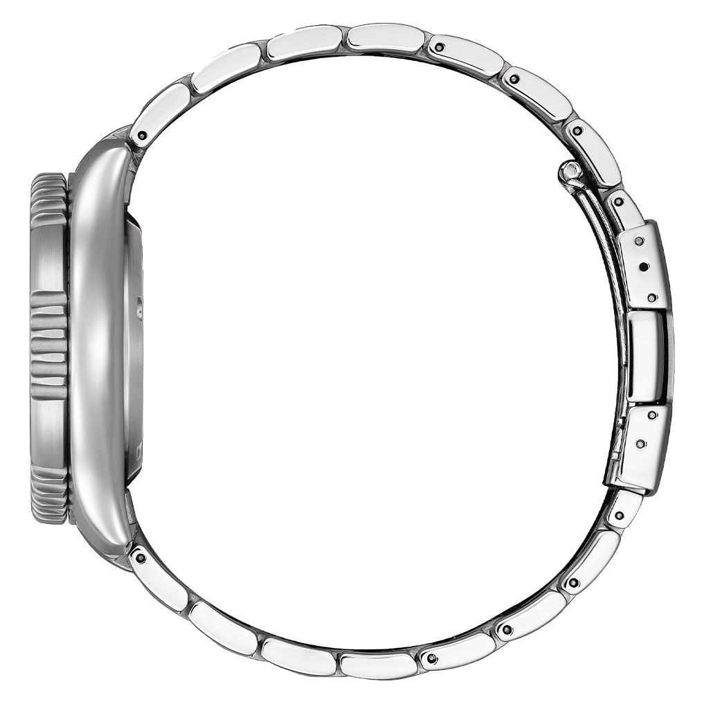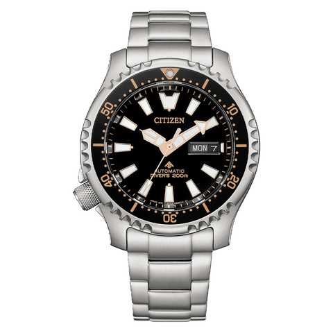 The Citizen Promaster Dive Automatic Limited Edition men’s watch is a bold reimagination of an iconic 1989 classic. Designed for modern dive watch enthusiasts, it incorporates the distinctive serrated bezel, inspired by the Japanese fugu (pufferfish), adding a unique touch to its design. The 42mm 3-piece stainless steel case is paired with a durable stainless steel bracelet, while the anti-reflective sapphire crystal ensures clear visibility. The black rotating bezel, framed by a grippy aluminum ring, encircles a black dial with luminous hands and markers for easy reading in low light. The case back is engraved with a fugu, symbolizing the watch’s heritage. This automatic timepiece is ISO-compliant with a screw-down crown for water resistance up to 200 meters. As a limited edition, it comes in a collector's dive tank, blending style and technical prowess for serious diving professionals and watch collectors alike.