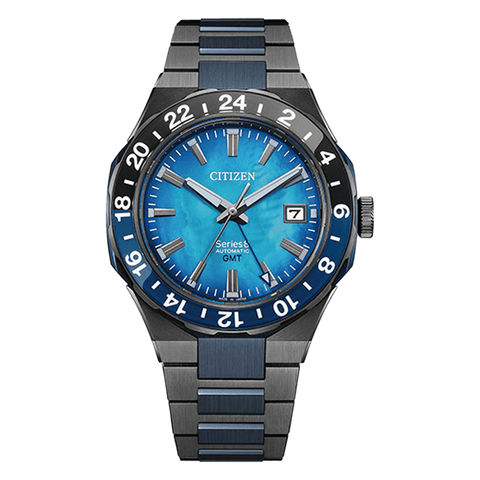 The Citizen Series 8 880 GMT blends modern design with practicality, making it ideal for both everyday wear and travel. Featuring a 41mm black and blue two-tone stainless steel case, this watch boasts a bi-directional bezel, 100m water resistance, and magnetic resistance up to 16,000 A/m. Powered by the Caliber 9054 movement, it offers dual time zone displays and a 50-hour power reserve. The blue mother-of-pearl dial with luminous hands and a green GMT hand ensures readability, while the stainless steel H-link bracelet adds style. Limited to 1,000 pieces worldwide.