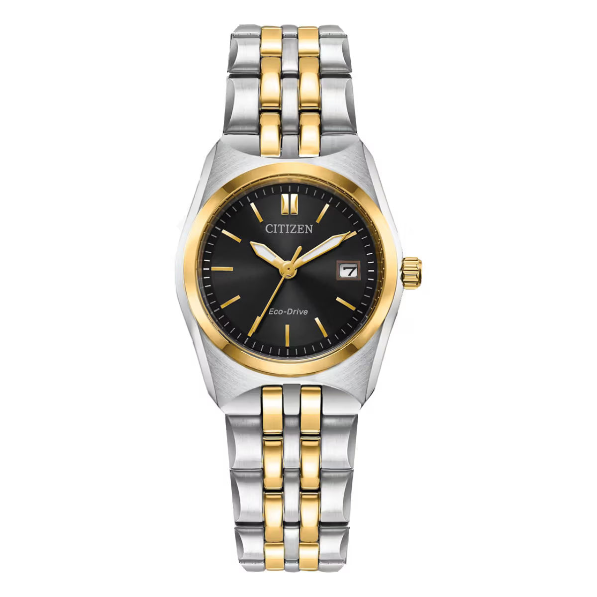 Timeless elegance meets modern functionality in the Citizen Corso Women’s Timepiece. This exquisite watch features a sophisticated two-tone gold and silver-tone stainless steel bracelet and case, paired with a sleek black 3-hand dial and date indicator. The luminous hands and gold-tone markers add a touch of radiance to the design. With a fold-over clasp closure and hidden push buttons, this timepiece ensures a secure and seamless fit, while offering water resistance up to 100 meters. Powered by Citizen’s Eco-Drive technology, it harnesses the power of any light source, eliminating the need for batteries. A perfect blend of style and sustainability, the Corso is the ideal addition to any wardrobe. Caliber Number E011.