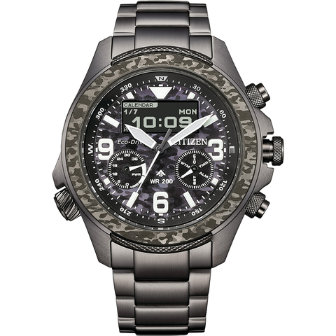 The Promaster Land Limited Edition celebrates 35 years of adventure with rugged, purpose-built technology and bold gray camouflage detailing. The 43.9mm stainless steel case features a gray IP coating and camo accents, ensuring durability. Its camo black dial with luminous hands offers high legibility, while digital and analog functions like world time, chronograph, and perpetual calendar make it mission-ready. Powered by Eco-Drive technology, it never needs a battery. This limited edition, with 200m water resistance and Caliber U822, is limited to 5,900 pieces and includes an interchangeable camo strap and a gray tackle box.