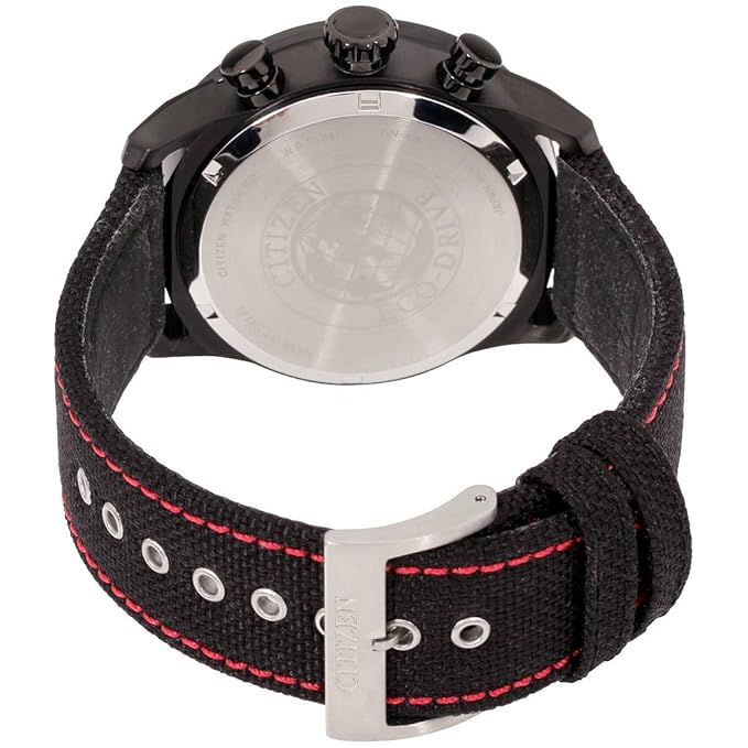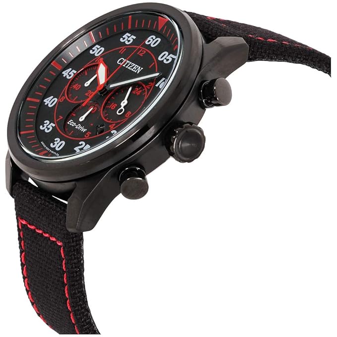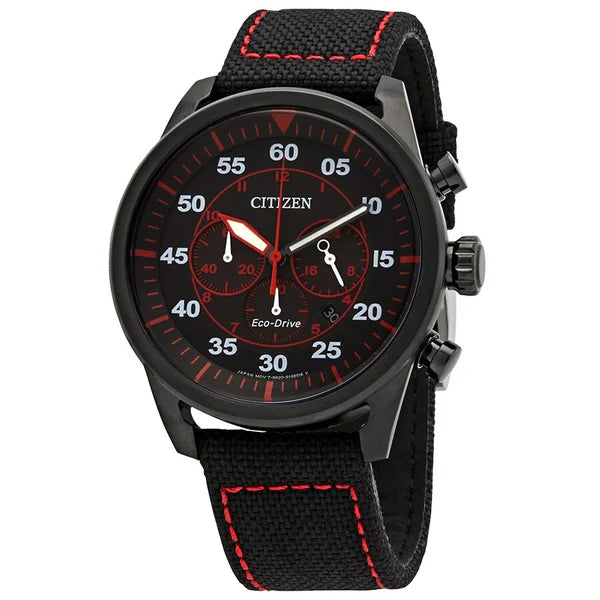 The Citizen Avion Chronograph Watch (CA4215-12E) features a bold black stainless steel case and nylon strap, complemented by a fixed black bezel. The sleek black dial showcases black-red hands, Arabic numerals, and a date display. Powered by Citizen’s Eco-Drive B620 quartz movement, it includes chronograph functions with 60-second, 60-minute, and 24-hour sub-dials. With a 45 mm case, scratch-resistant K1 crystal, and 100-meter water resistance, this stylish sport watch offers reliable performance and durability.