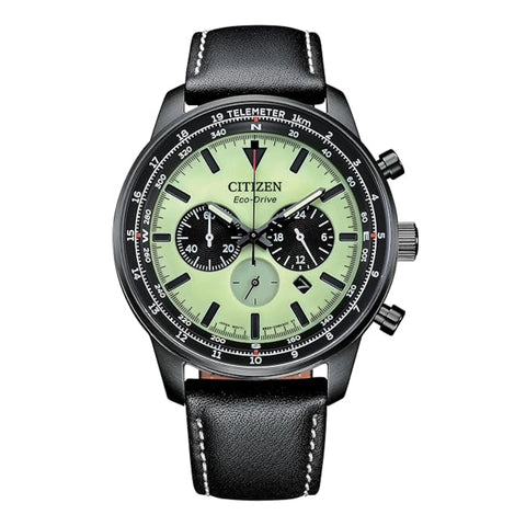 Give your wristwear a modern edge with this refined men’s analog watch from Citizen’s Eco-Drive collection. Designed with a sleek black leather strap, it adds a touch of understated sophistication to any ensemble. The striking green round dial—protected by durable mineral glass and set within a bold 44 mm case—features an eye-catching chronograph layout that blends style with functionality. Finished with a classic buckle clasp for a secure and comfortable fit, this timepiece is both a dependable companion and a standout accessory.