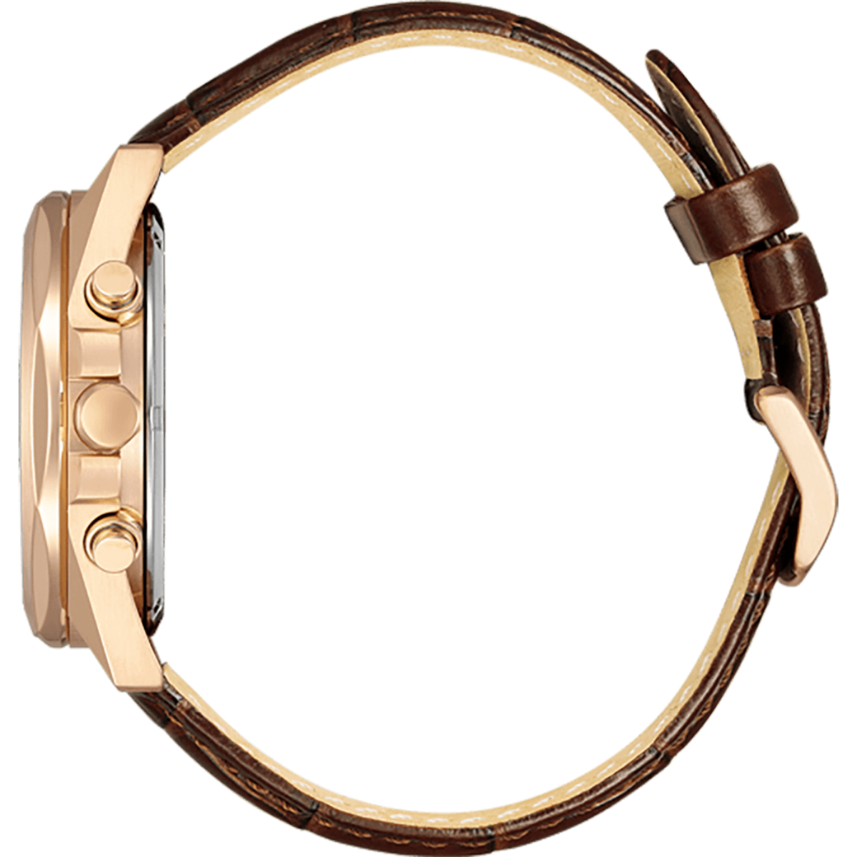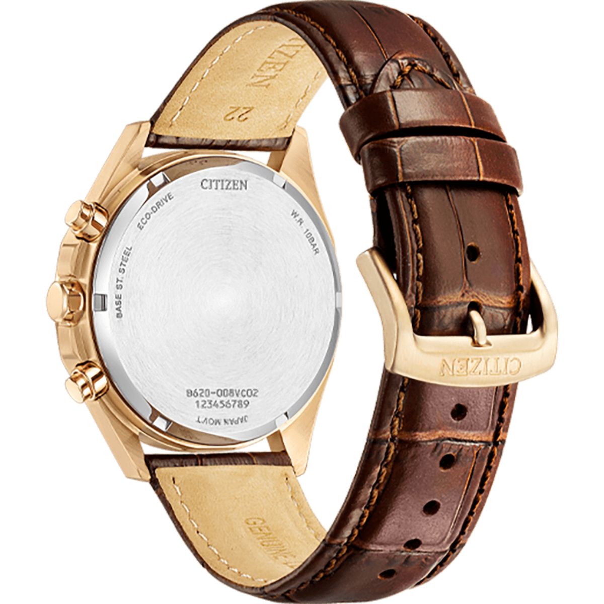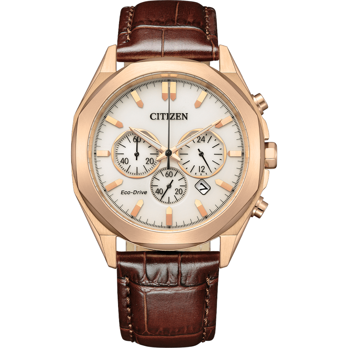 This Eco-Drive Chronograph watch seamlessly combines vintage charm with modern technology. Housed in a luxurious rose gold-plated case, the cream dial features rose gold sub-dials for a sophisticated monochrome look. The brown calf leather strap adds timeless elegance with detailed stitching. Powered by Eco-Drive, the watch charges from any light source, offering up to 9 months of power. Featuring a chronograph, 24-hour display, date function, and water resistance up to 10 bar, this watch is a perfect blend of style, precision, and sustainability.