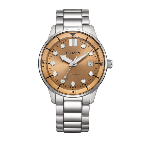 The Citizen NJ0191-83X is a distinguished men's automatic watch featuring a 40mm stainless steel case and matching band, offering a perfect blend of strength and sophistication. Its eye-catching salmon-colored dial sets it apart, providing a warm and unique aesthetic, while luminous hands and markers ensure clear readability. Powered by the Caliber 8210-CA0 automatic movement, it operates at 21,600 vibrations per hour (vph) and includes a convenient date display at the 3 o'clock position. With a water resistance of up to 100 meters (10 BAR), it's well-suited for swimming and light water activities. Its 12.2mm thickness offers a sleek yet substantial presence, making it an ideal choice for those seeking a watch that combines both practicality and distinctive style.