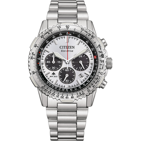 The Citizen CA4660-61A is a robust and stylish men's chronograph watch from the Promaster collection, blending precision and design. With a 40mm silver-tone stainless steel case featuring sharp faceting and a satin finish, this watch exudes sophistication. The matching triple-link stainless steel bracelet offers durability and comfort. Its silver-tone dial, highlighted with red, black, and white accents, ensures easy readability, while the sapphire crystal protects it from scratches. A slide-rule scale on the bezel adds a functional aviation-inspired touch. Powered by Citizen's Eco-Drive technology, the watch is light-powered, eliminating the need for battery replacements. It includes a chronograph function that measures up to 60 minutes, a date display, and is water-resistant up to 200 meters, making it perfect for everyday use and various activities.