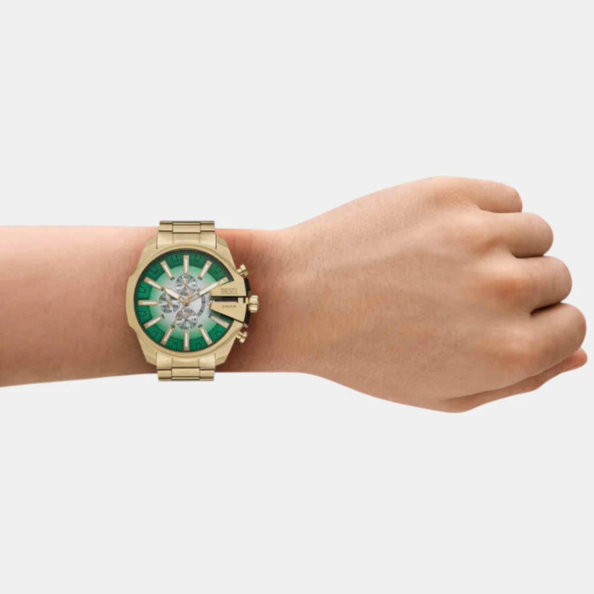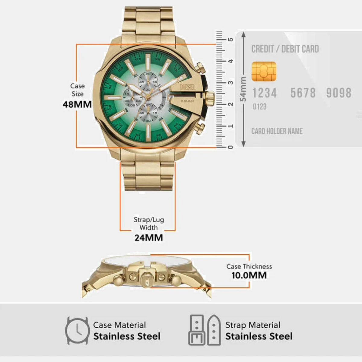 Bold design meets refined craftsmanship in the Diesel Mega Chief Slim 48mm Watch. This striking timepiece boasts a distinctive brushed sunray dial blending gold, green, and silver tones — a fusion of color that commands attention. Powered by a precision chronograph movement, it's as functional as it is stylish. The gold-tone stainless steel bracelet adds a touch of luxury, completing a look that's confident, modern, and unmistakably Diesel. Perfect for those who aren't afraid to stand out.