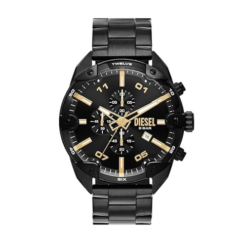 Designed for true watch enthusiasts, this Diesel men's analog watch effortlessly blends style and precision. Featuring a sleek black round dial shielded by durable mineral glass, it offers clear readability and a timeless look. The 49mm Spiked model boasts a sophisticated black sunray dial and reliable chronograph movement, while the black stainless steel strap adds a bold, modern edge. With a convenient crown for easy time adjustment and a secure fit, this timepiece is the ultimate accessory to elevate your everyday style.