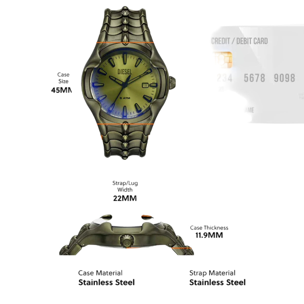 Step into the spotlight with the Diesel Vert 44mm watch — a bold expression of modern style. Featuring a striking green iridescent crystal and a sleek silver sunray dial, this timepiece captures attention from every angle. Powered by a reliable three-hand date movement, it combines functionality with standout aesthetics. The matching green stainless steel bracelet adds a cohesive edge, making it the perfect accessory for those who dare to be different. With the Vert, Diesel delivers a watch that’s as fearless as you are.