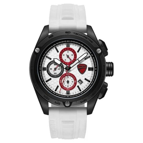 Experience precision and style with a watch that speaks the language of speed. The Ducati DTWGC0004304W features a crisp white dial accentuated by bold chronograph sub-dials, making it as functional as it is striking. Its quartz movement guarantees accurate timekeeping, while the stainless steel case and white silicone strap provide durability and all-day comfort. Designed for men who crave a blend of sporty elegance and modern sophistication, this timepiece is perfect for both casual outings and high-energy days. The chronograph function allows you to measure time with precision, while the sleek design ensures you always stand out with subtle, refined style.