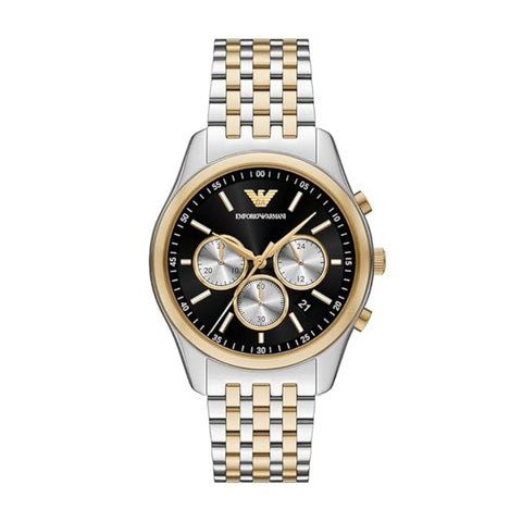 Upgrade your everyday look with the Emporio Armani AR11713 Quartz Chronograph—a refined blend of modern design and timeless elegance. Its eye-catching two-tone bracelet, crafted from gold and silver-tone stainless steel, provides a bold contrast to the sleek 41 mm case. The black sunray dial, accented with polished silver subdials, delivers a sophisticated depth and clarity that stands out at any angle. Driven by reliable Japanese quartz movement, this chronograph ensures accurate timekeeping with effortless style. Meticulously designed and beautifully finished, the AR11713 is an ideal choice for men who appreciate a watch that makes a confident and contemporary statement.