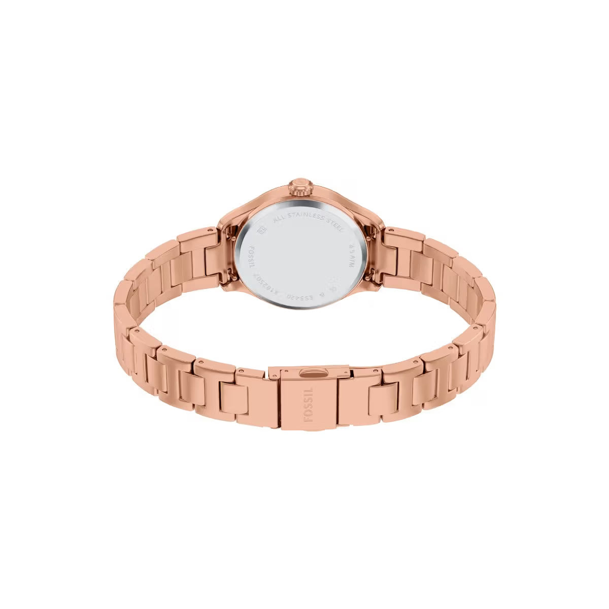 Delicate yet striking, this rose gold-tone stainless steel watch brings elegance in a compact form. The petite round case seamlessly connects to a matching bracelet, creating a unified and graceful silhouette. Its silver dial, accented with a satin-sunray finish, catches the light with a soft, dimensional glow. From the fluid bracelet links to the finely textured dial, every element is crafted with attention to detail—offering a timeless accessory that blends subtle luxury with everyday sophistication.