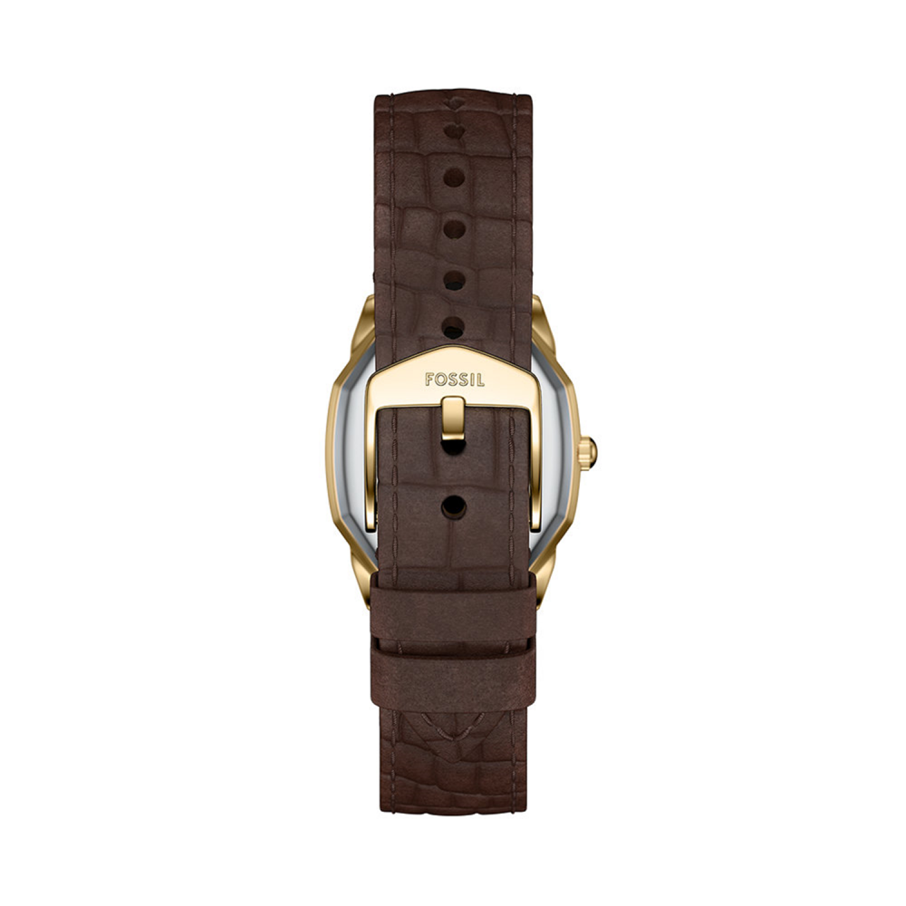 Distinctive in form yet timeless in appeal, this watch features a striking octagonal gold-tone stainless steel case that frames a textured cream dial for a touch of vintage sophistication. The brown leather strap, styled with classic croco embossing, adds warmth and elegance, perfectly balancing the geometric boldness of the case. Designed with a compact silhouette, it offers a refined presence on the wrist while delivering lasting comfort and durability. A thoughtfully crafted piece that brings subtle character to everyday style.
