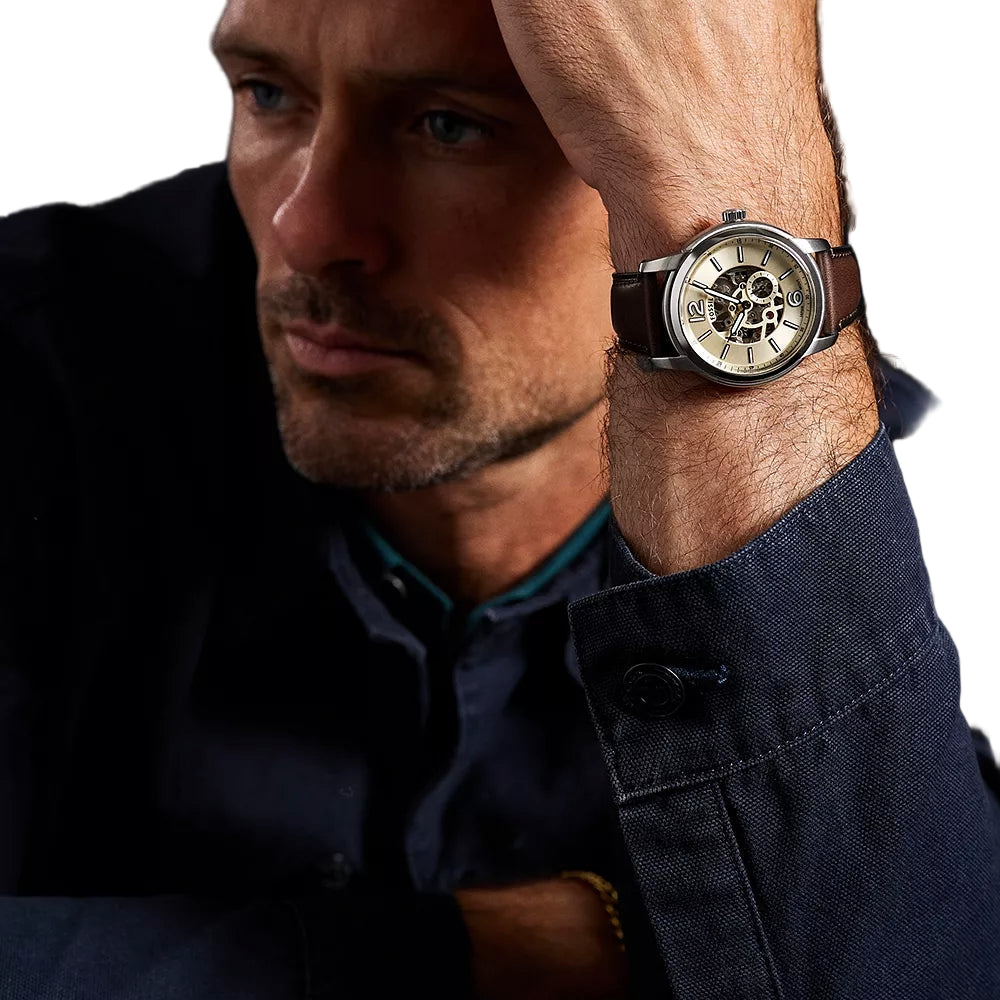 Decades of watchmaking expertise come to life in this finely engineered timepiece, featuring a sophisticated three-piece stainless steel case with a stepped profile for added depth and dimension. The cream skeleton dial reveals the intricacies of its precise automatic movement, framed by a double-domed, scratch-resistant sapphire crystal that offers both clarity and durability. Paired with a rich dark brown leather strap—sourced responsibly through the Leather Working Group—this watch honors tradition while embracing refined, contemporary style. It’s heritage redefined for the modern collector.