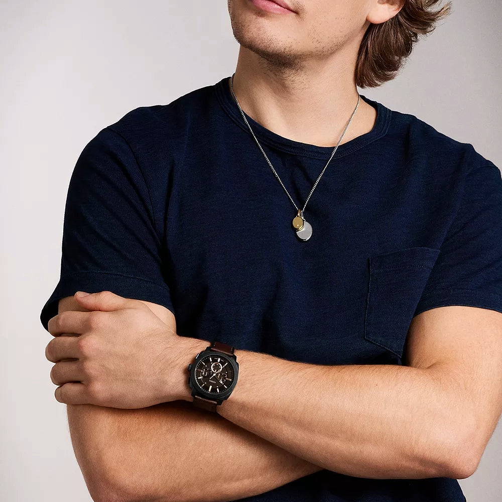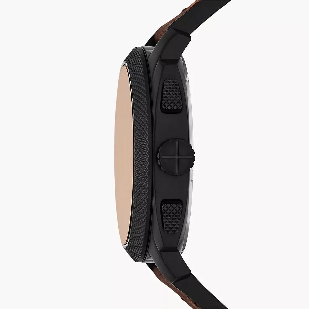 Inspired by the strength and precision of classic American machinery, the Machine Chronograph is crafted for those who appreciate industrial design with a rugged edge. Its substantial 44 mm case frames a brushed black dial, detailed with layered textures and protected by a distinctive amber-tinted mineral crystal—adding a vintage touch to its modern build. The watch runs on a precision quartz chronograph movement, delivering reliable timekeeping for everyday wear. Complemented by a rich brown leather strap, responsibly sourced through the Leather Working Group, this timepiece is more than just a watch—it's a bold statement of craftsmanship and character.