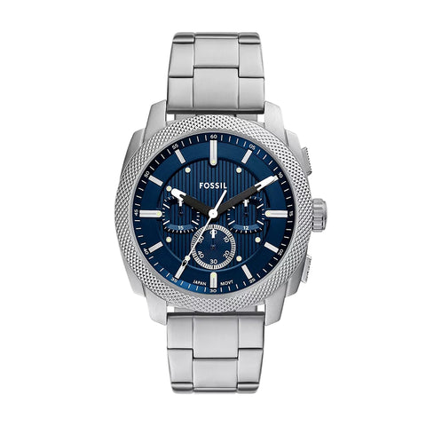 Channeling the spirit of rugged American engineering, the Fossil Machine Chronograph is crafted for those who appreciate power and precision. Its bold 44mm case is accentuated by a signature knurled topring, while the brushed blue dial with industrial-style textures delivers a distinctive, masculine edge. Housed under a tough mineral crystal, the chronograph is powered by a reliable quartz movement and finished with a robust stainless steel bracelet. Designed to endure and made to impress, this watch is a confident expression of strength and style.