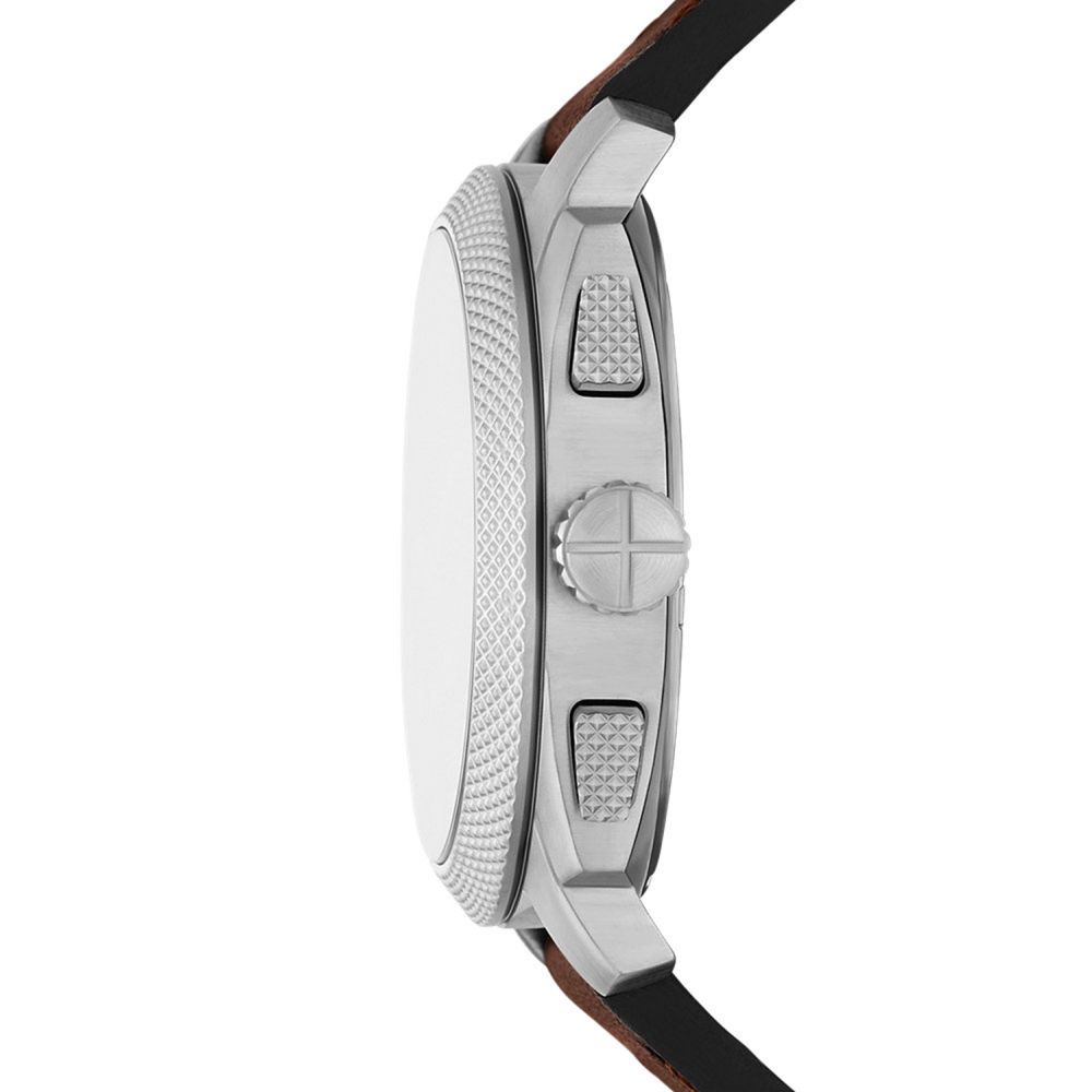 Engineered with the spirit of classic American machinery, the Machine Chronograph makes a bold impression with its signature knurled topring and oversized 44 mm case. The brushed green dial adds rugged depth, enhanced by textured detailing and shielded by a durable mineral crystal. Inside, a precise quartz chronograph movement delivers reliable performance. Finished with a rich brown leather strap that adds warmth and contrast, this watch is as tough as it is refined. Crafted with care, the leather supports responsible practices through the Leather Working Group. A striking fusion of industrial design and everyday durability.