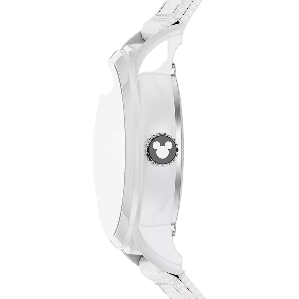 Suit up for an interstellar adventure with this extraordinary limited-edition Fossil Heritage automatic watch featuring Disney’s beloved Mickey Mouse. Dressed as an astronaut, Mickey floats across a deep blue dial scattered with shimmering stars, while a rotating Saturn moonphase adds cosmic charm by tracking the seconds. Housed in a 40mm stainless steel case with a white ceramic coating inspired by space shuttle thermal paint, this timepiece captures the spirit of exploration. The crisp white nylon strap, accented with a bold red stripe, nods to the iconic detailing of a space suit. Flip it over to reveal custom artwork and individual edition numbering on the caseback, along with a glimpse of the precise Japanese automatic movement that fuels the journey. A perfect fusion of playful nostalgia and expert craftsmanship, this watch is more than a timepiece—it's a collector's launchpad to the stars.
