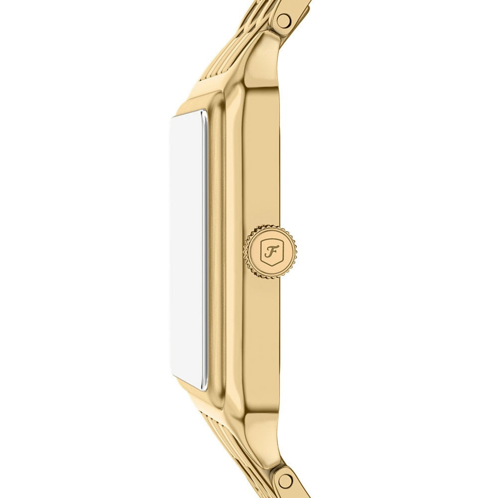 This elegant timepiece features a sleek rectangular gold-tone stainless steel case perfectly matched with a coordinating bracelet, creating a unified and sophisticated look. The lustrous mother-of-pearl dial brings a delicate shimmer and depth, enhanced by precise three-hand movement and a convenient date window for daily use. Crafted with premium materials, this mid-sized watch effortlessly blends classic refinement with contemporary style—ideal for any occasion.