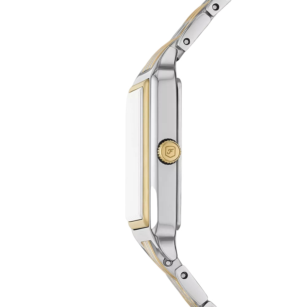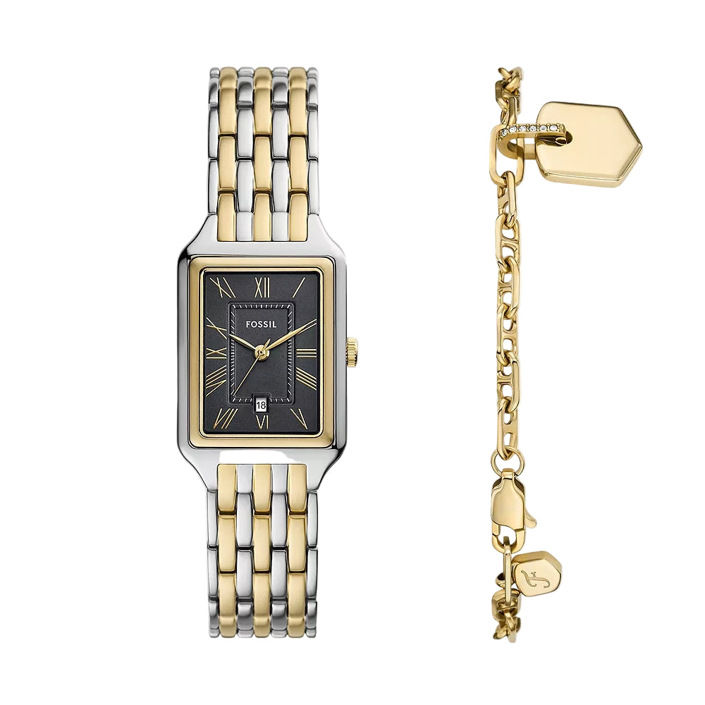 Elevate your wrist game with this effortlessly chic watch and bracelet set. Featuring the iconic Raquel watch, reimagined with a sleek rectangular case, grey dial, and a two-tone seven-link stainless steel bracelet, it offers a refined balance of vintage charm and modern polish. Paired with a gold-tone bracelet showcasing Fossil’s signature Heritage D-link design, this duo creates the perfect layered look—sophisticated, versatile, and ready to shine from day to night.