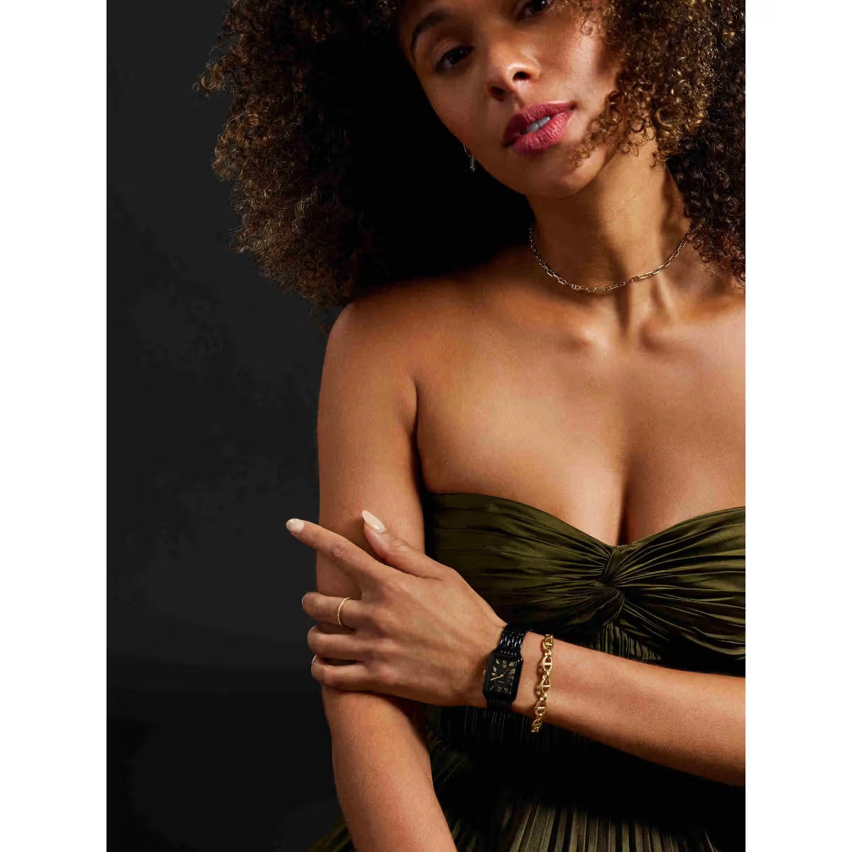 A timeless classic reimagined—our iconic rectangular Raquel watch returns with elevated modern touches. Designed with a sleek silhouette, it showcases a lustrous black dial paired with a precise three-hand date movement. The refined seven-link bracelet, crafted in polished black stainless steel, adds a bold yet versatile finish, making it the perfect accessory for both everyday wear and elegant occasions.