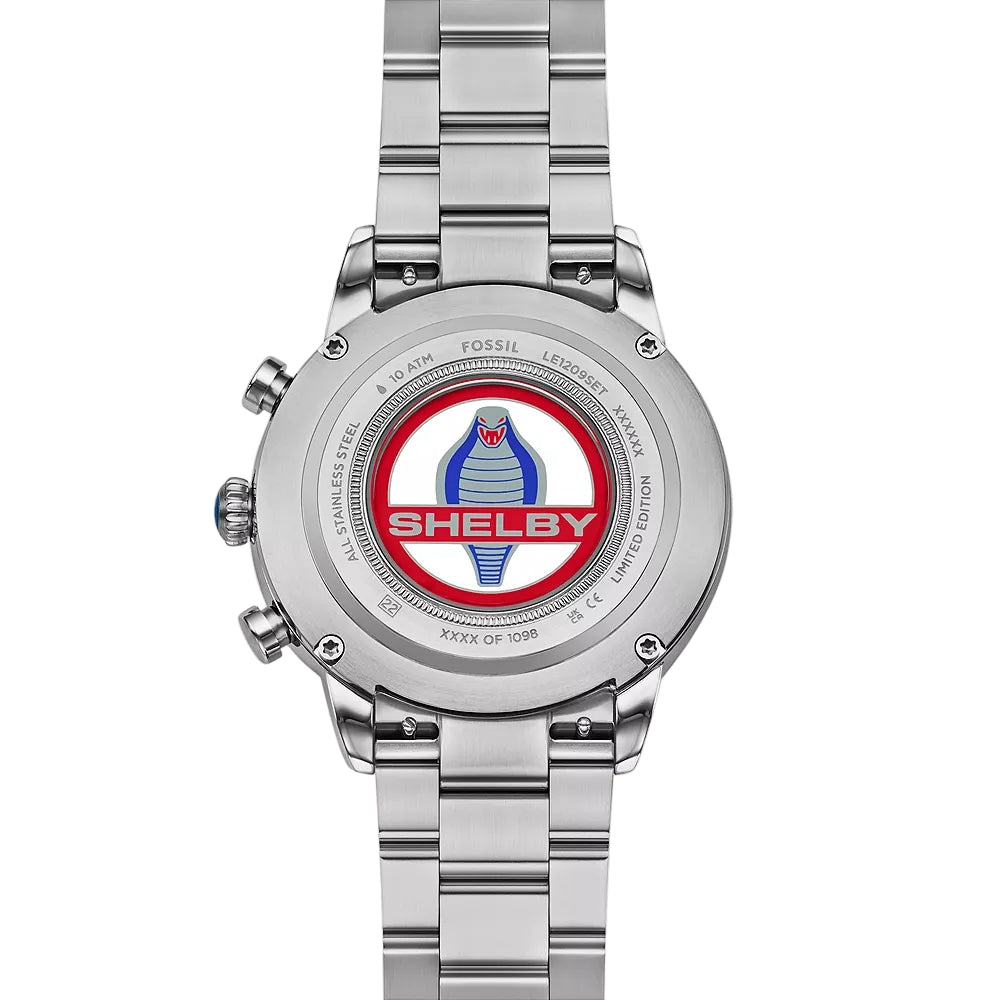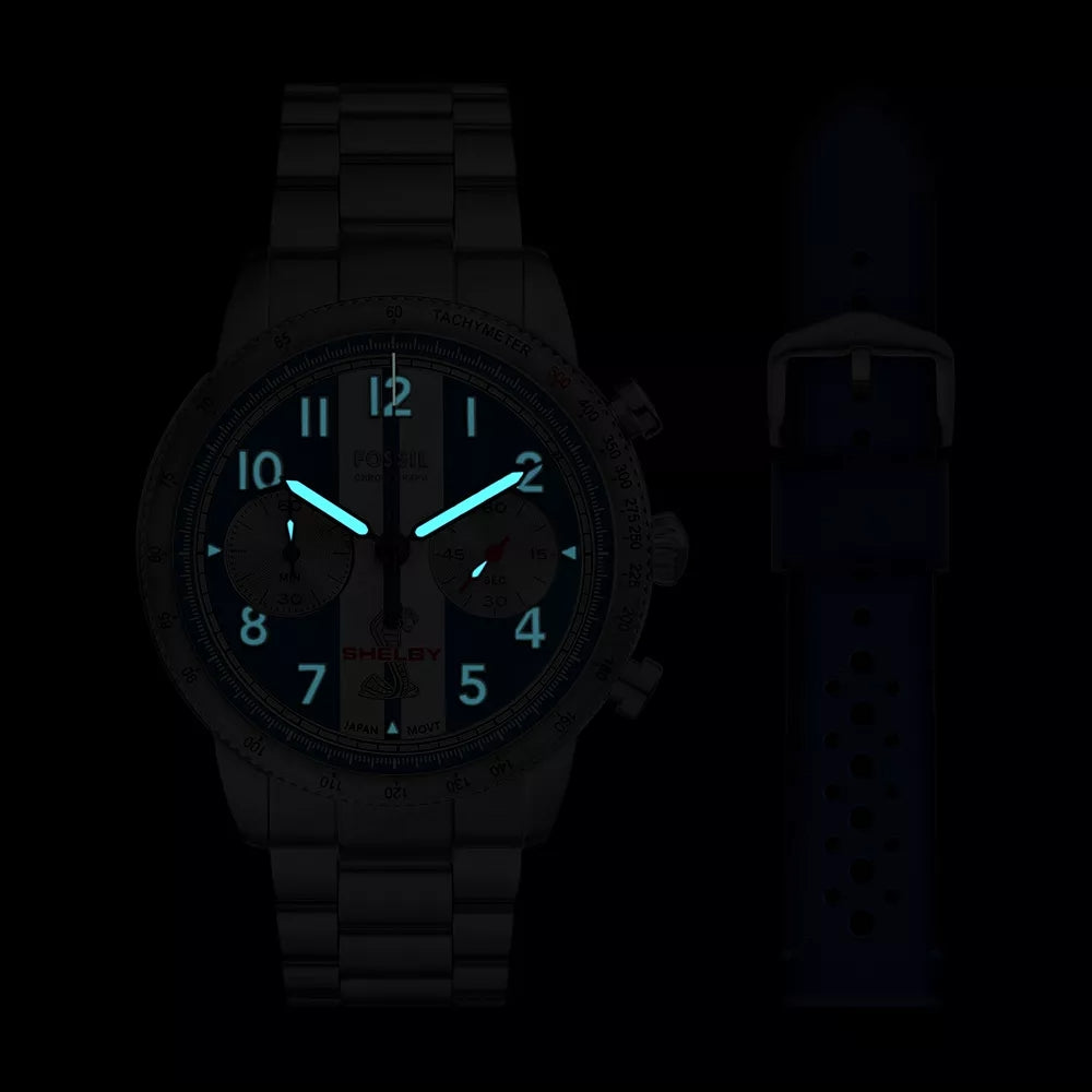 high-performance precision. Inspired by the iconic Shelby Cobra, this timepiece channels the spirit of classic motorsport with its bold colorways, aerodynamic curves, and race-ready functionality. At its heart lies a sophisticated Japanese center-second racing chronograph, paired with an etched tachymeter bezel and dual subdials to keep every second on track. Built for resilience and style, it features a scratch-resistant sapphire crystal, 10 ATM water resistance, and a solid stainless steel bracelet. For added versatility, a premium navy leather strap is included — allowing you to switch gears in style. This is more than a watch. It’s a statement of speed, legacy, and engineered excellence.